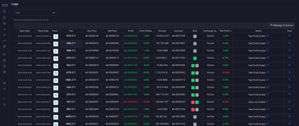 Once a position is sold, you will see it in the Logs section, with a quick summary of the sell like the profit, how it was sold, the fees, etc.